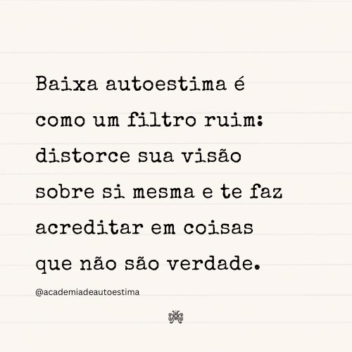 Não nascemos com Autoestima, esta é uma construção que aprendemos a fazer baseado na forma como fomos tratados, como interpretamos o valor que acreditamos que as outras pessoas nos deram, nas nossas experiências e alguns outros fatores. O que você pensa de você mesma não é necessariamente verdade, provavelmente não é, é “só” uma construção que você aprendeu a medida que foi se desenvolvendo.